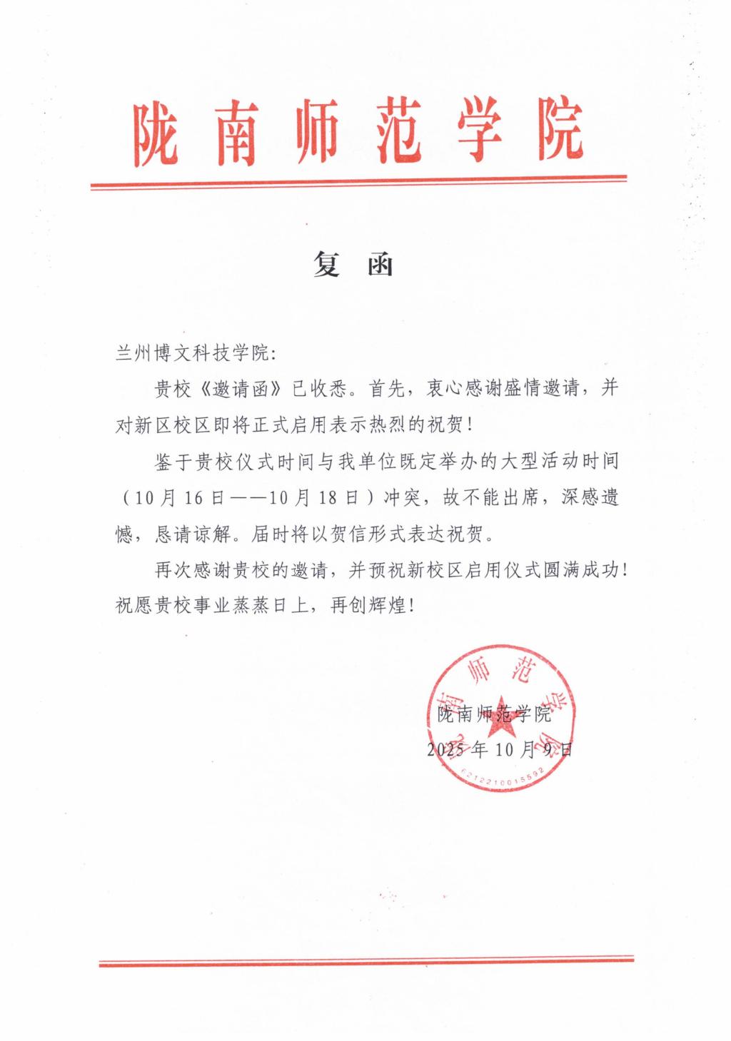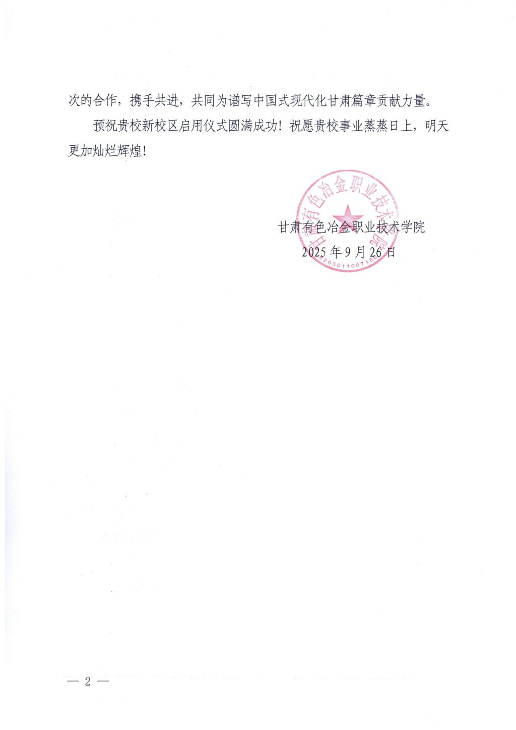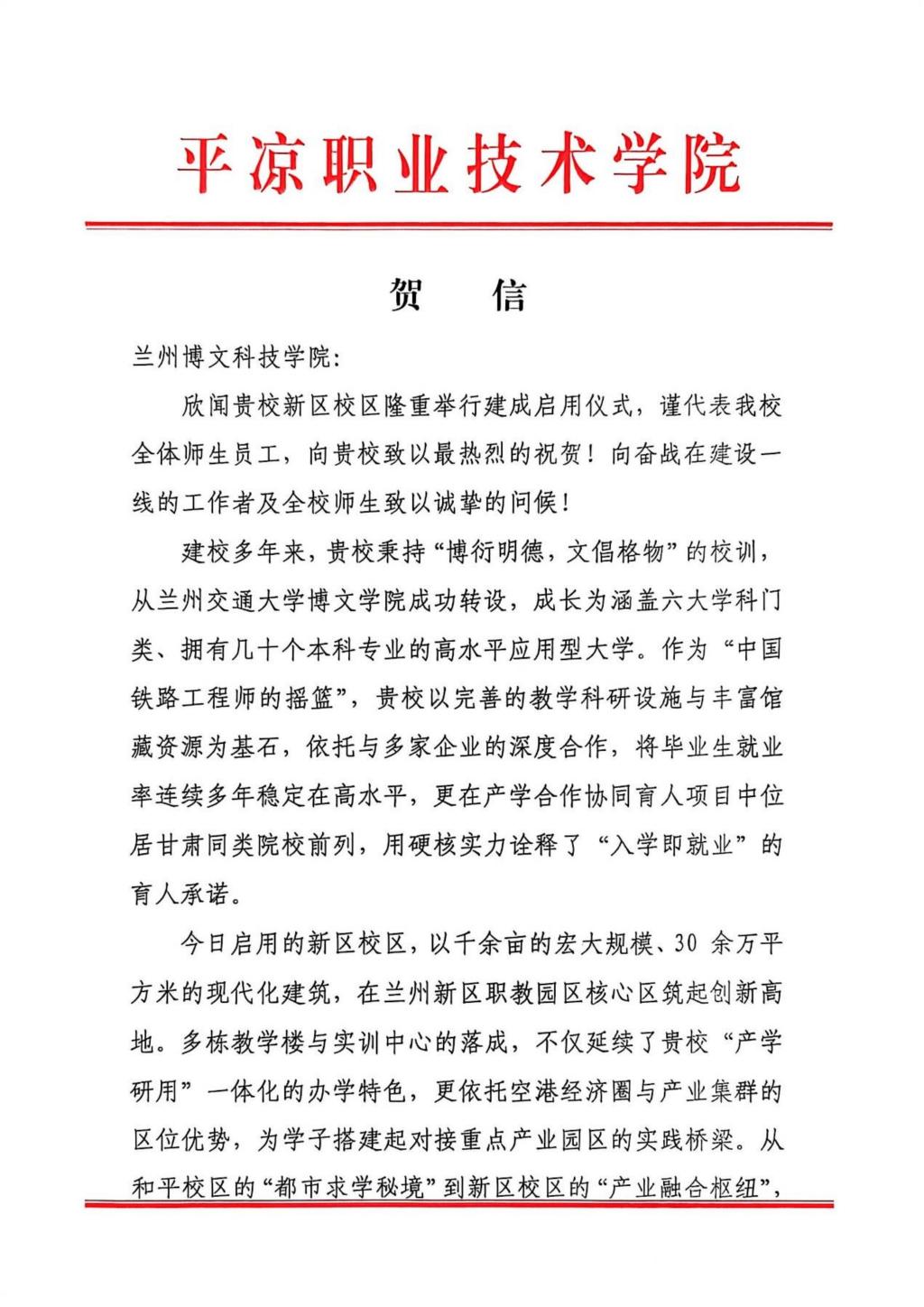 各高校在贺信中一致表达了对兰州博文科技学院新区校区顺利启用的热烈祝贺与美好祝愿。各高校均期待以此为契机,未来能在学科建设、人才培养及科研创新等领域,与兰州博文科技学院进一步深化交流,拓展合作空间,携手为高等教育事业的高质量发展贡献力量。