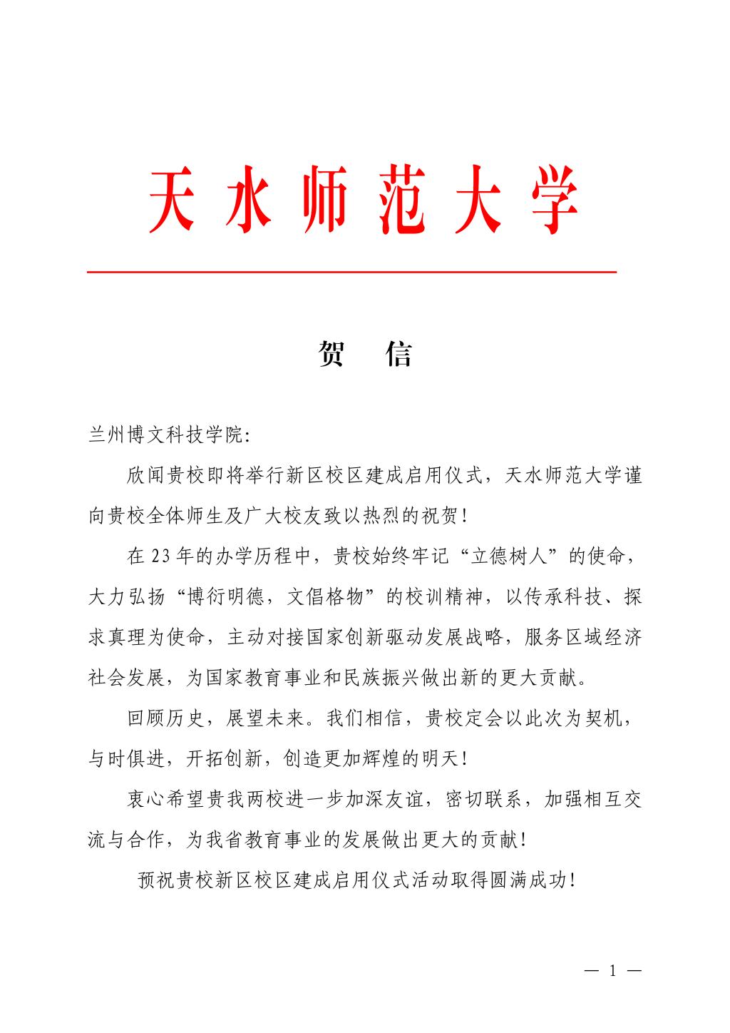 兰州博文科技学院将正式迎来新区校区启用仪式。值此之际,学校陆续收到来自国内外多所高校发来的贺信,共同庆贺新区校区正式启用。