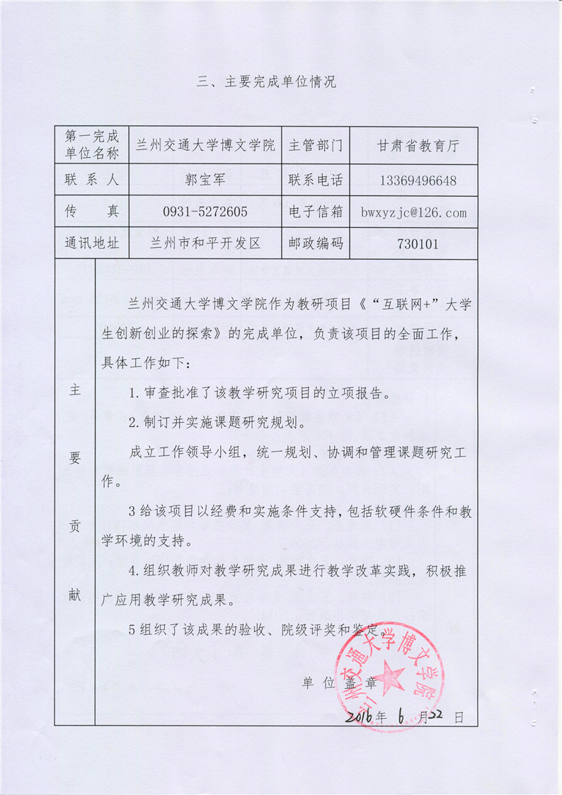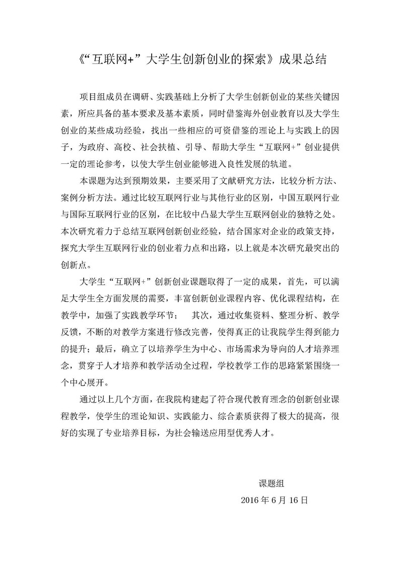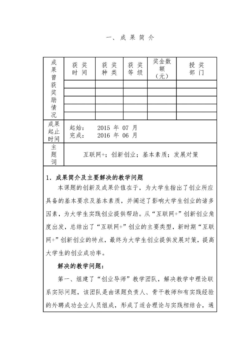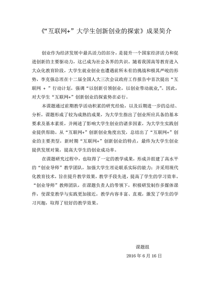 《“互联网+”大学生创新创业的探索》成果推荐材料(2016年6月申报)