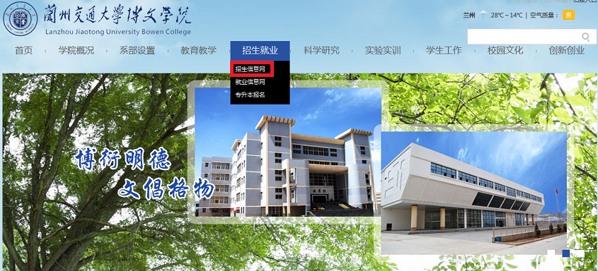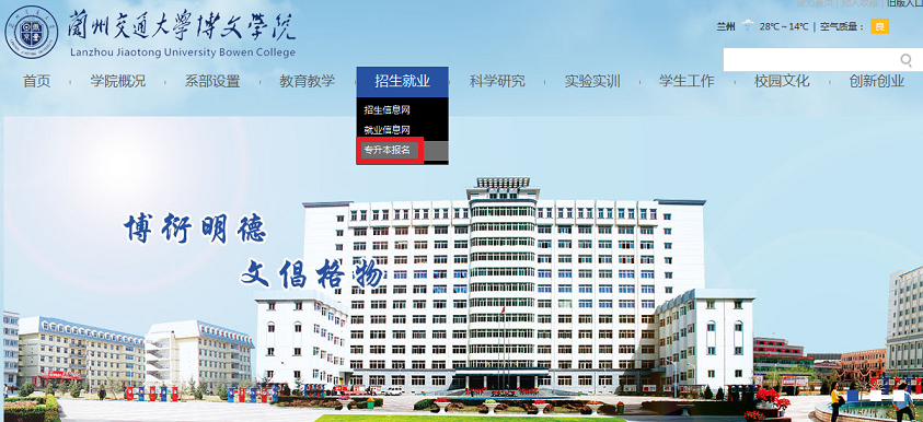 第一步:进入兰州交通大学博文学院官网,点击招生就业导航栏,进入招生信息网,进入专升本报名。